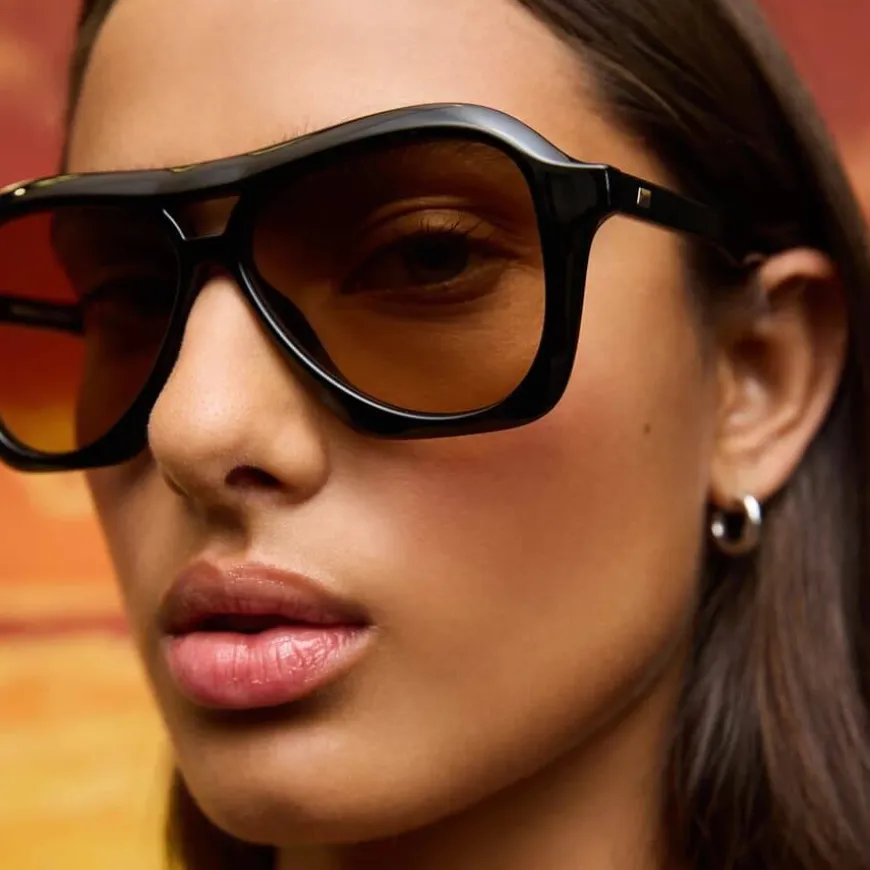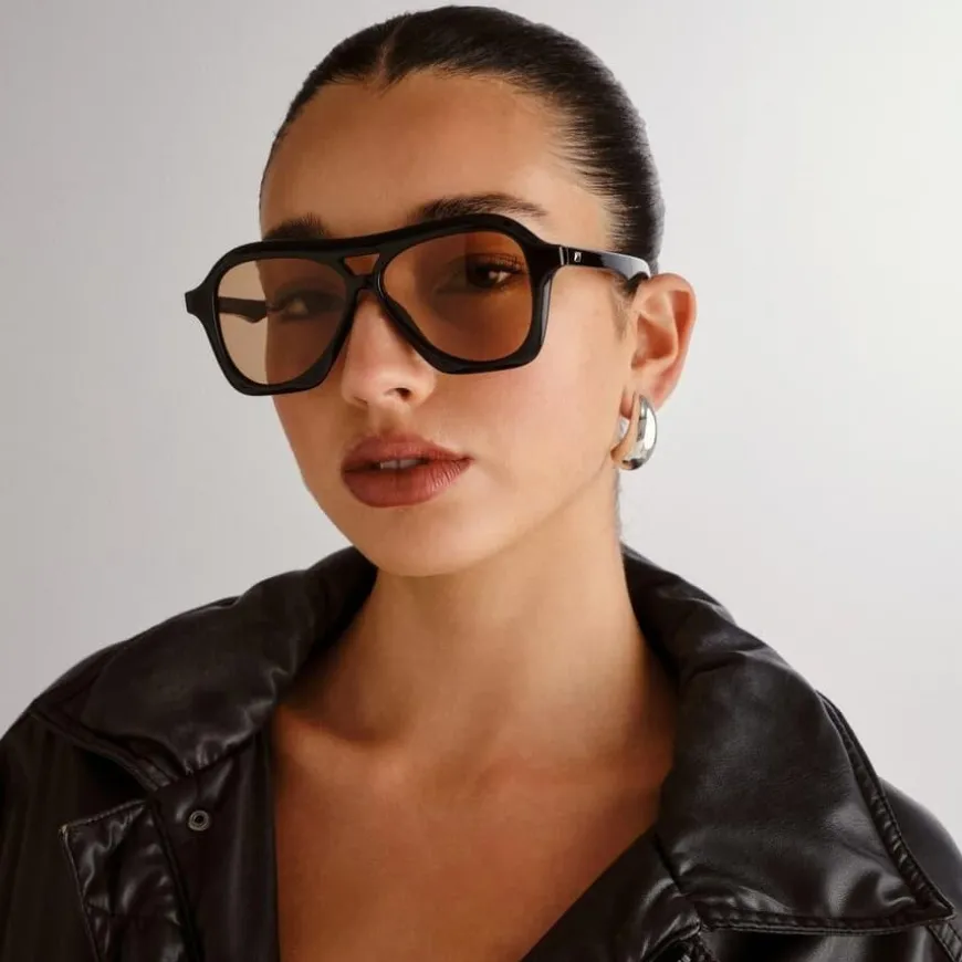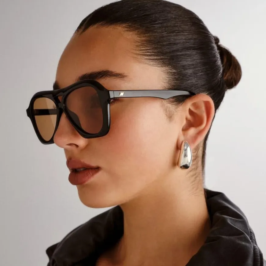 Le Specs Drizzle er en moderne aviator-solbrille inspirert av millennial popkultur. Den midtstørrelse-passformen og den tredimensjonale fasongen gir en flatterende unisex-look, mens de subtile pyramidestuds-detaljene på stengene tilfører en edgy finish.