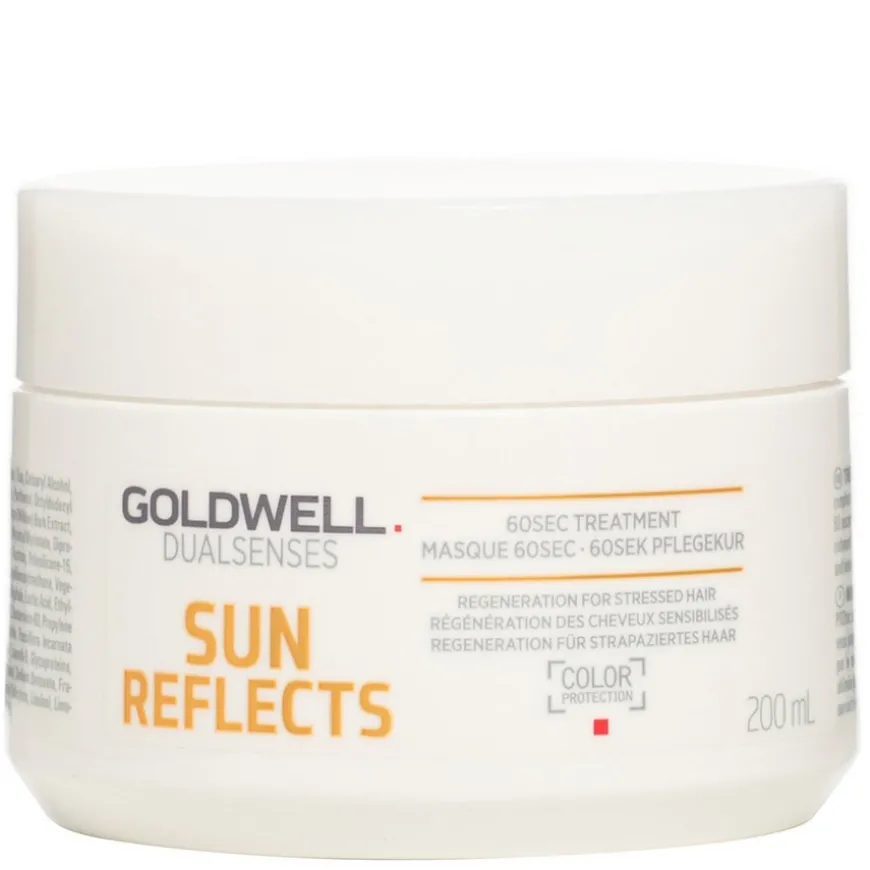 Goldwell Dualsenses Sun Reflects After-Sun 60sec Treatment beskytter og pleier håret mot skade fra saltvann, klor og sol. Reparerer og pleier håret med olje fra pasjonsfrukt, samt bevarer fuktigheten og får håret til å dufte like deilig.