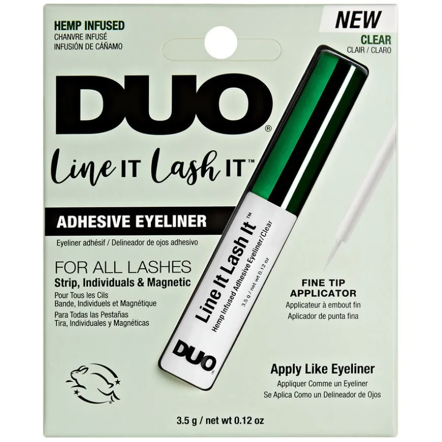 Duo Line It & Lash It Hemp Infused Clear er en selvklebende eyeliner for alle typer vipper. Påføres som en vanlig eyeliner. Penselapplikator med fin spiss skaper en ren linje uten søl.Enkel to-trinns påføring for å skape en unik vippelook hver gang. Den er også vannfast, så du kan le eller gråte uten å tenke på at vippene skal falle av.