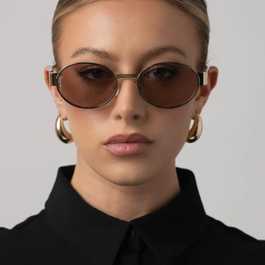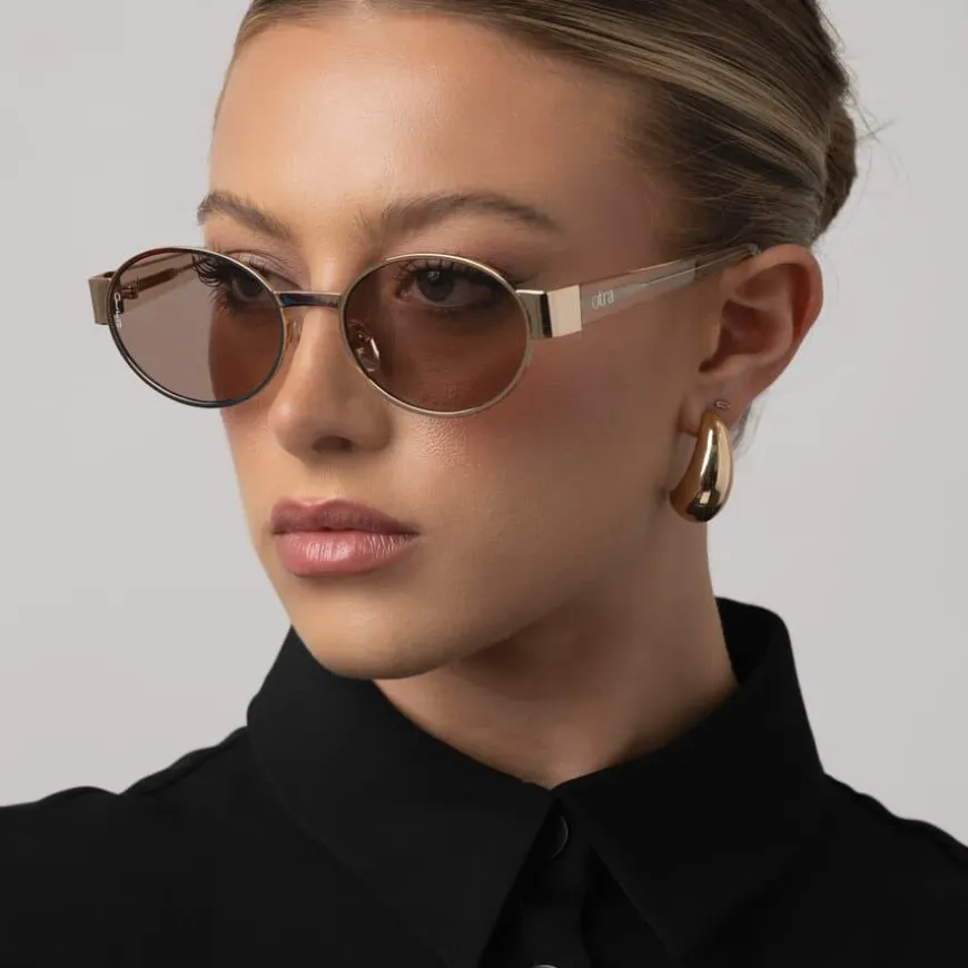 Echo Gold/Brown er en elegant og moderne solbrille fra Otra Eyewear. Solbrillen har ovale linser og en stilfull gullfarget metallinnfatning med champagnefargede stenger som gir et luksuriøst og tidløst preg. Linsene kommer i en varm brun nyanse og har linsekategori 3 for god beskyttelse mot sterkt sollys. Solbrillen gir 100% UV-beskyttelse, og den diskrete «Otra»-logoen finnes både på siden og på glasset for en subtil signatur. Solbrillen leveres i et beskyttende, vegansk etui.