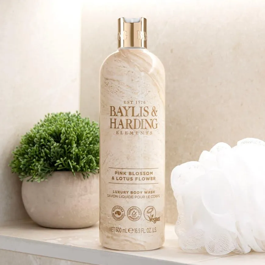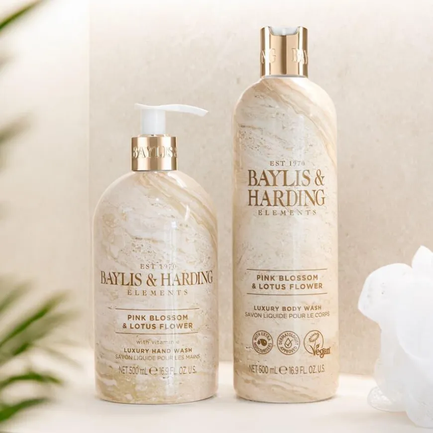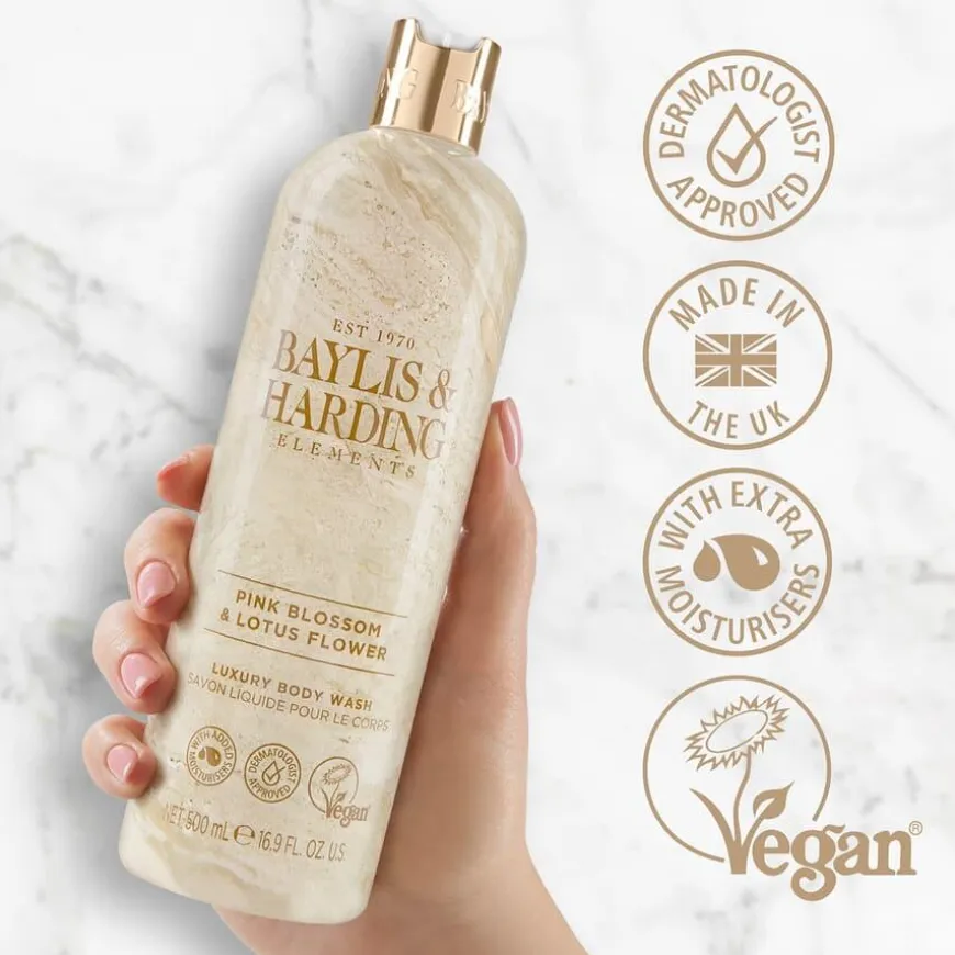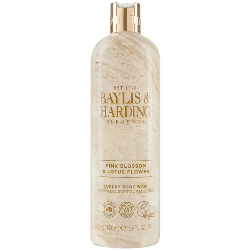 Elements-kolleksjonen fra Baylis & Harding er utviklet for å matche med interiøret på badet; benkeplater, fliser og møbler. Flasken har et moderne og elegant design inspirert av rosa marmor med sølvdetaljer som pynter opp i rommet den står i. Såpen rengjør kroppen skånsomt og etterlater huden myk og velduftende. Inneholder vitamin E, er dermatologisk testet og vegansk.