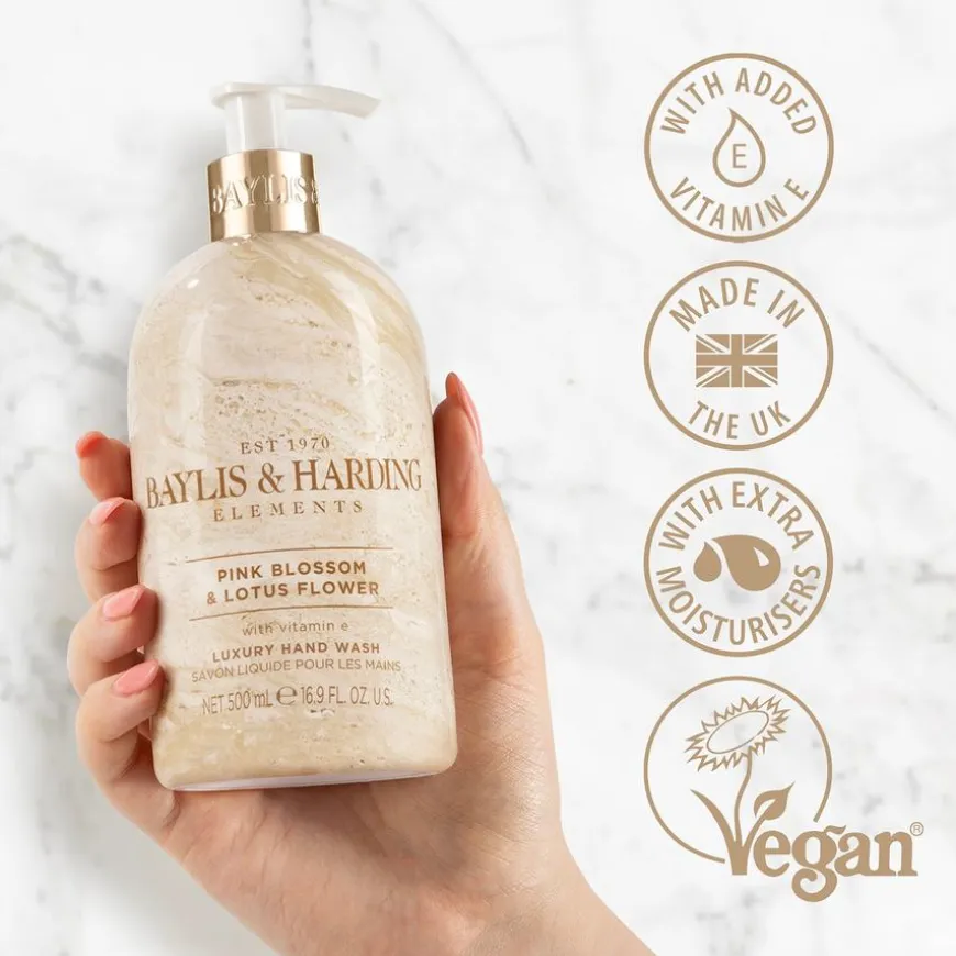 Elements-kolleksjonen fra Baylis & Harding er utviklet for å matche med interiøret på badet og kjøkkenet; benkeplater, fliser og møbler. Flasken har et moderne og elegant design inspirert av rosa marmor med sølvdetaljer som pynter opp i rommet den står i. Såpen rengjør hendene skånsomt og etterlater hendene myke og velduftende. Inneholder vitamin E og er vegansk.