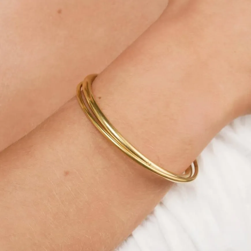 Elma Triple Bangle Bracelet er en elegant trio av bangles i rustfritt stål med 18k gullbelegg, designet for å gi umiddelbar stil og fleksibilitet. Armbåndene er vannbestandige og kan brukes samlet for et statement eller hver for seg for en mer subtil look. Den 7mm brede designen gir både glans og karakter – perfekt for hverdagsbruk eller fest. Et tidløst tilskudd til smykkesamlingen din. Laget av Happy People og fri for nikkel, kadmium og bly.