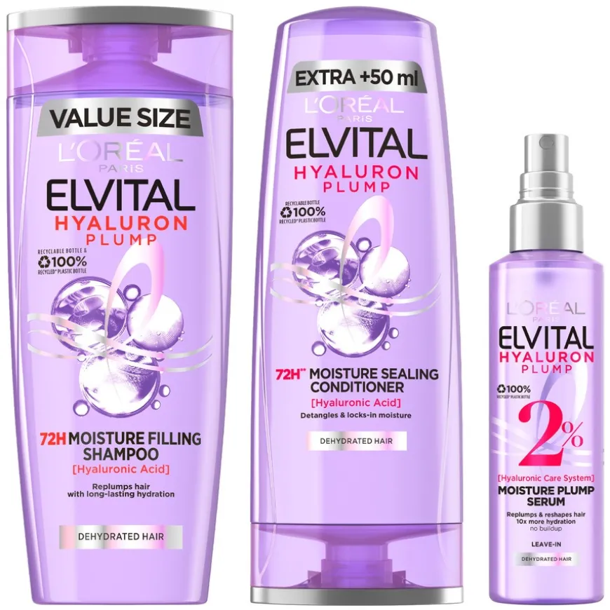 L’Oréal Paris Elvital Hyaluron Plump Leave-in Spray 150ml + Shampoo 400ml + Conditioner 300ml er en trio som gir optimal fuktighet til dehydrert hår. Hyaluronsyren, naturlig tilstede i kroppen, absorberer 1000 ganger sin egen vekt i vann, og er nøkkelingrediensen som gir håret en fyldigere og glansfullere fremtoning. Fra den fuktighetsgivende Hyaluron Plump-shampooen og balsamen som gjør håret lettere å gre ut, til det daglige leave-in serumet som gir 10x mer fuktighet uten å tynges ned, gir denne serien en omfattende løsning for vitalisert og strålende hår.