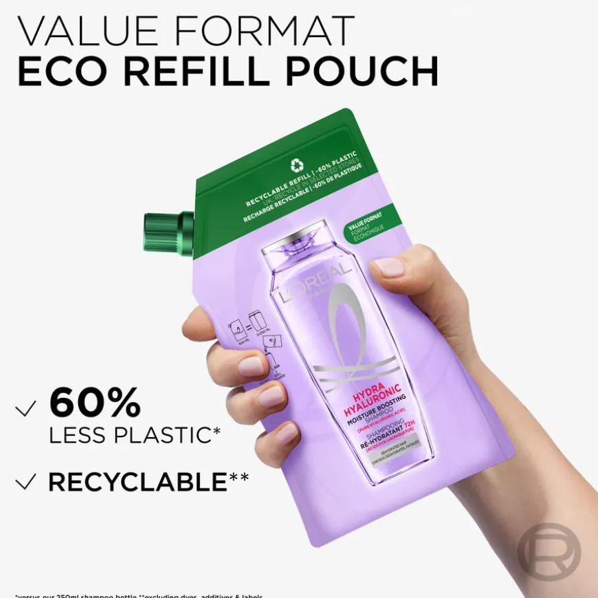 Resirkulerbar refillpose som er fremstilt 60% mindre plast enn enn en 500 ml shampooflaske.