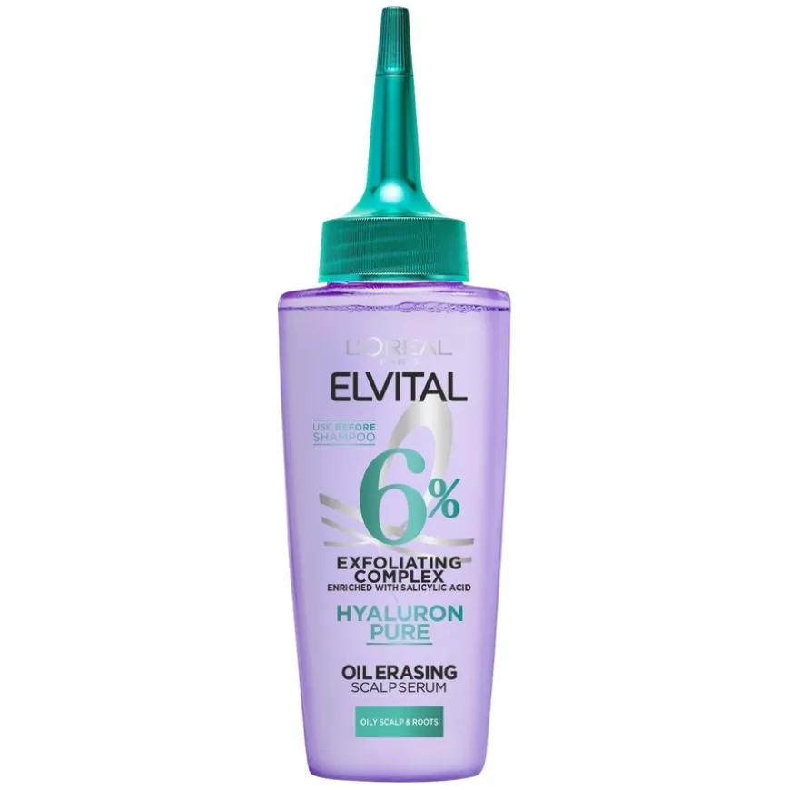 L’Oréal Paris Elvital Hyaluron Pure Oil Erasing Serum er et serum som er utviklet til fet hodebunn og tørre lengder. Formelen fjerner produktrester og olje fra hodebunnen og gir en ren følelse i opptil 72 timer*. Inneholder 6% eksfolierende kompleks beriket med salisylsyre og hyaluronsyre Brukes sammen med Elvital Hyaluron Pure rensende shampoo og fuktighetsgivende balsam.