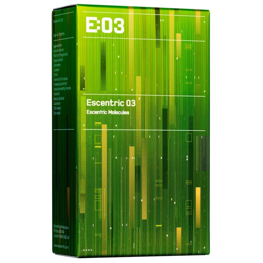 Escentric 03 hedrer Vetiveryl Acetate, en naturlig rot + syntetisk hybrid. Vetivers forlokkende sensuelle aromatiske smak går utover komposisjon. Denne akkorden har en ren skarphet med en skarp brusende kvalitet som spiller vakkert i landskapet av huddufter. Se for deg en mild elv renner gjennom grønne sletter. I horisonten står en varm og gyllen sol opp bak et sett med luftige skyer. Dette er ikke et pastoralt maleri eller en pittoresk scene revet fra sidene til en litterær klassiker. Dette er et luktminne om Escentric 03. Vetiverylacetat kan beskrives som et hybridmolekyl, halvt syntetisk, halvt naturlig. Det er en brøkdel av vetiverolje destillert fra røttene til et indisk gress, som deretter «krysses» med eddiksyre for å fjerne de bitre og læraktige aspektene ved roten. Escentric 03 fokuserer på Vetiveryl Acetate i en formel som hyller de tre røttene som brukes i parfyme: vetiver, ingefær og orris. «Jeg ønsket at Escentric 03 skulle få frem luktinntrykket av disse røttene og vise hvordan de harmonerer med hverandre,» sier Geza Schoen. Ingefær dominerer toppnoten som er levende, grønn og krydret med limeskall og grønne pepperkorn. Hjertet er en rik, fløyelsmyk orris med egyptisk sjasmin og te noter. Tørkingen understreker den komplekse jordnærheten til vetiver sammen med sandeltre, sedertre, myke balsamer og musk. Resultatet er en krydret, men likevel frisk og elegant chypre med treaktige, balsamicotoner – det berusende treffet av mørkegrønne tre noter når du passerer tropisk gress, men langt jevnere og mykere.