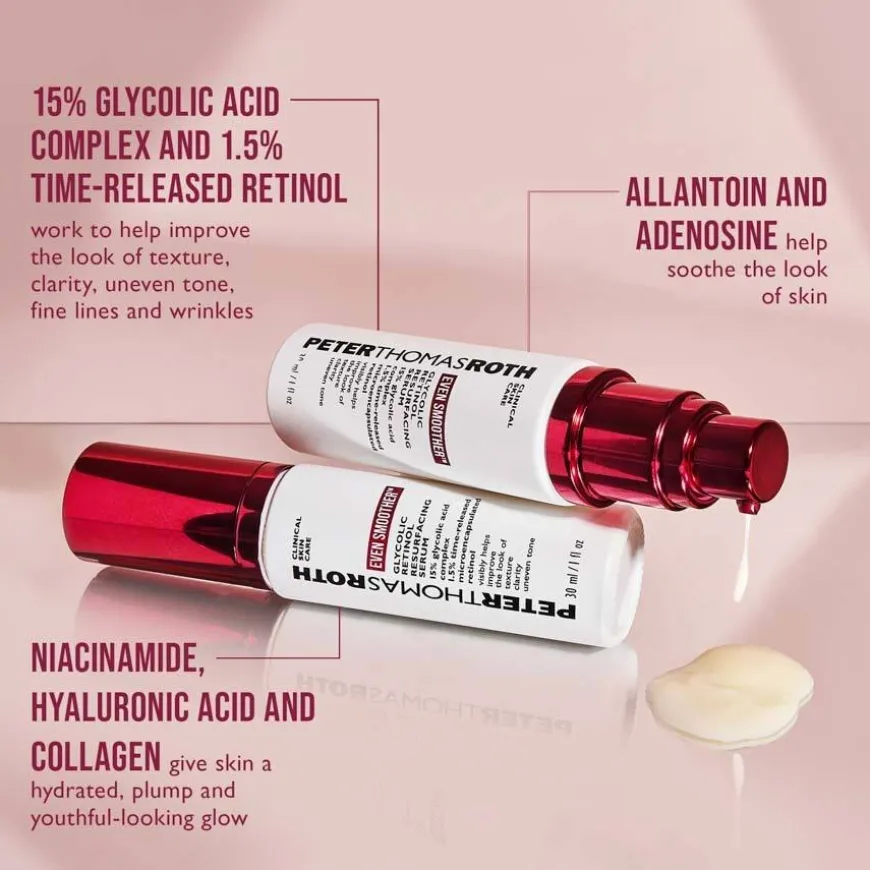 - 15% Glycolic Acid Complex og 1,5% Time-Released Retinol: Bidrar til å forbedre utseendet på tekstur, klarhet, ujevn hudtone, fine linjer og rynker.