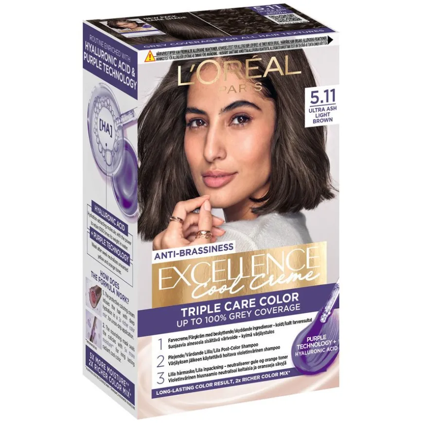 L’Oréal Paris Excellence Cool Crème er en permanent hårfarge for deg som ønsker å dekke grå hår og motvirke gule og orange toner. Hårfargen inneholder pleiende ingredienser for å beskytte og styrke håret samtidig som det farges. Excellence Cool Crème tilbyr klassiske og elegante farger som gir et kaldt fargeresultat som holder lenge. Triple Care Color-ritualet er beriket med hyaluronsyre for å tilføre fukt og og Purple-teknologi for å nøytralisere uønskede gule og orange toner. Tre steg for å styrke og beskytte håret samtidig som det farges. Formel beriket med hyaluronsyre for 5x mer fukt** og en 2x fyldigere fargeblanding* slik at den ikke drypper når du påfører. Dekker grå hår opptil 100 % og passer til alle hårtyper.