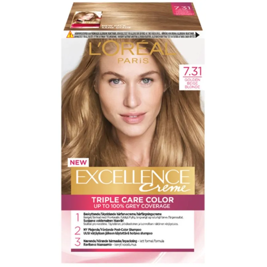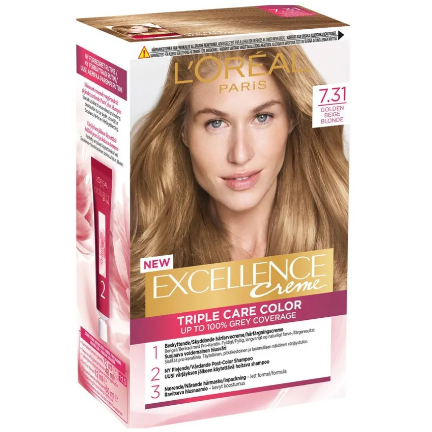 L’Oréal Paris Excellence Crème er en permanent hårfarge for deg som ønsker å dekke grå hår og samtidig beskytte håret mens det farges. Excellence Crème tilbyr klassiske og elegante farger som gir et vakkert fargeresultat som holder lenge. Triple Care Color-ritualet består av tre trinn for å styrke og beskytte håret samtidig som det farges. Formel beriket med hyaluronsyre for 10x mer fukt** og en 2x fyldigere fargeblanding slik at den ikke drypper når du påfører. Dekker grå hår opptil 100 % og passer til alle hårtyper.