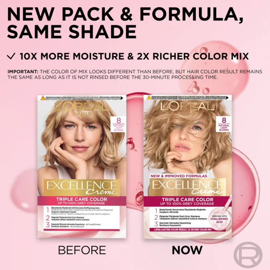 L’Oréal Paris Excellence Crème er en permanent hårfarge for deg som ønsker å dekke grå hår og samtidig beskytte håret mens det farges. Excellence Crème tilbyr klassiske og elegante farger som gir et vakkert fargeresultat som holder lenge. Triple Care Color-ritualet består av tre trinn for å styrke og beskytte håret samtidig som det farges. Formel beriket med hyaluronsyre for 10x mer fukt** og en 2x fyldigere fargeblanding* slik at den ikke drypper når du påfører. Dekker grå hår opptil 100 % og passer til alle hårtyper.