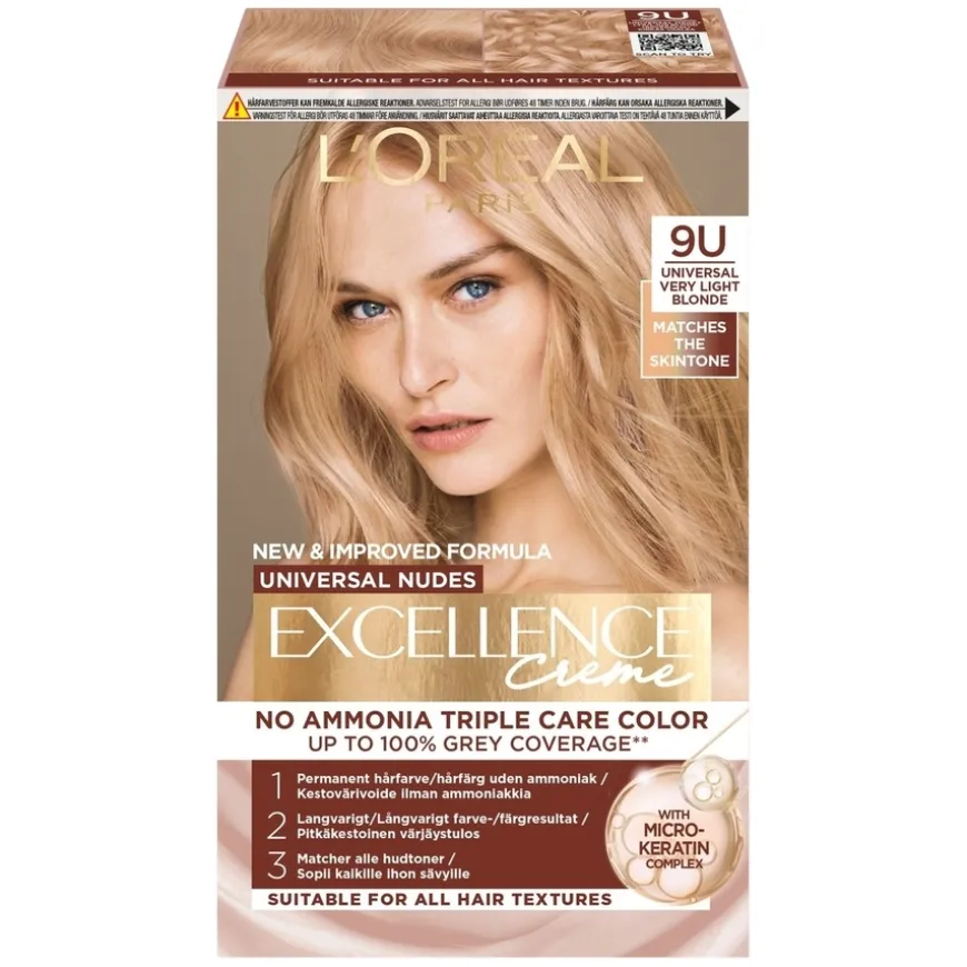 L’Oréal Paris Excellence Universal Nudes er en permanent hårfarge uten ammoniakk til alle hårtyper. Nyansene er utviklet for å passe til alle hudtoner og dekker grå hår opptil 100 %. Formelen gir håret næring og glans**.