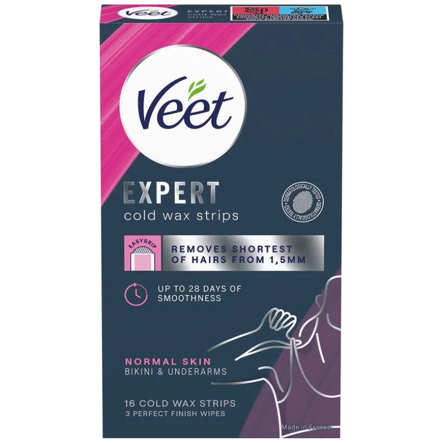 Expert Cold Wax Strips Bikini & Underarms Normal Skin er voksstrips med EasyGrip™-flik som hjelper deg med å fjerne de korteste hår (1,5mm) fra roten, selv ved første påføring. Voksen inneholder sheasmør, som er kjent for sine fuktighetsgivende egenskaper; Huden eksfolieres og holder seg glatt i opptil 28 dager.
