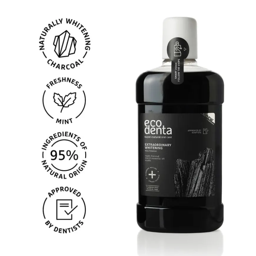Extraordinary Whitening Charcoal Mouthwash er et oppfriskende og beskyttende munnskyll som hjelper med å bekjempe plakk og bevare et sunt tannkjøtt. Den inneholder aktivt kull, kjent for sine rensende og blekende egenskaper, og gir en langvarig følelse av frisk pust. Munnskyllet hjelper også med å redusere bakterier i munnhulen for en forbedret oral hygiene.