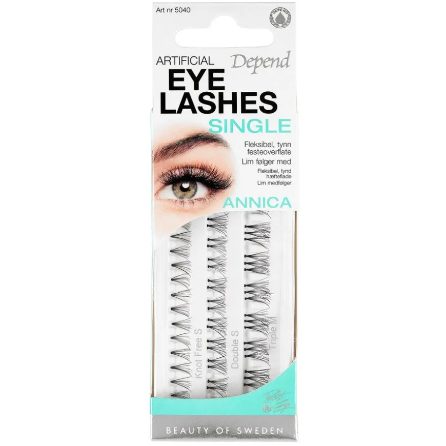 Depend Eye Lashes Single Annica er individuelle vipper for en naturlig look. Gi sminken et mer intenst look med et par kvalitetsvipper som gjør at looken holder hele dagen og kvelden. Håndlaget av syntetisk hår som er spesielt utvalgt for den absolutt beste kvaliteten. Vippen har en fleksibel, tynn festeflate, er fjærlett og gir en naturlig følelse med maksimal komfort. Kan gjenbrukes. Lateksfritt, holdbart lim følger med i pakken.