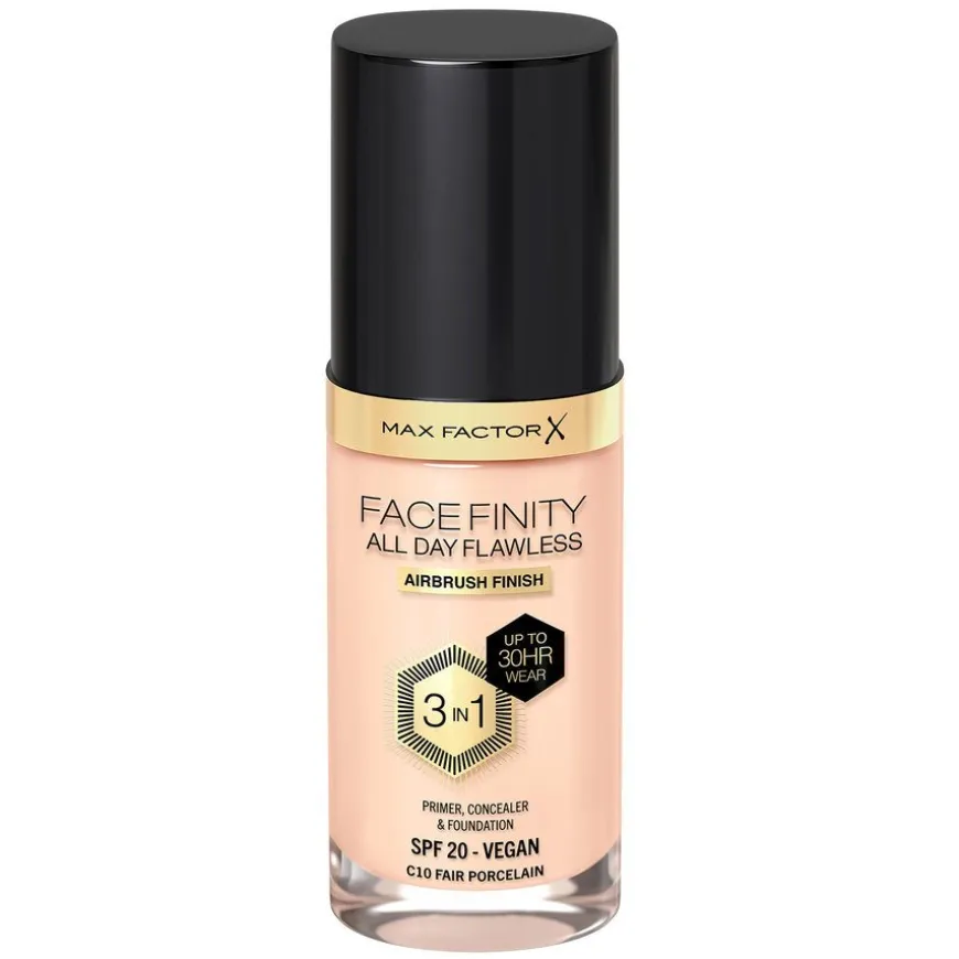Facefinity All Day Flawless 3-In-1 Foundation er en 3-i-1 flytende foundation som også fungerer som ansiktsprimer og concealer for å tilby opptil 30 timers bruk som varer hele dagen. For en feilfri, langvarig look, er det Max Factor Facefinity All Day Flawless Foundation nå med Climate Proof Protection. Den lette og pustende veganske formelen gir fantastisk dekkevne som skjuler rødhet og ufullkommenhet.