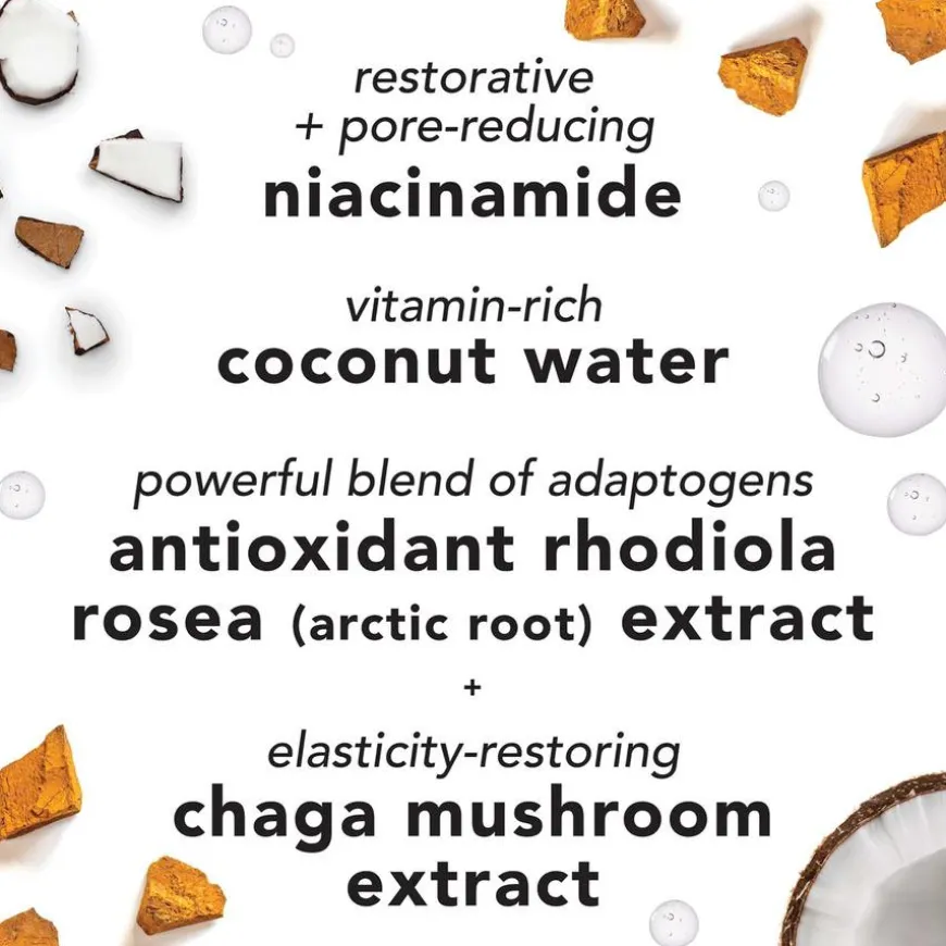 Fuktsprayen skaper en strålende duggfrisk glød. En kombinasjon av adaptogener (adaptogene plante- og rotekstrakter) hjelper til med å gi næring til huden, bekjempe hudaldring og forbedre hudens generelle utseende. Hyaluronsyre og niacinamid gir ekstra fuktighet og hjelper huden å opprettholde fuktighetsnivåer med sine fuktighetsbevarende og okklusive egenskaper. Aloe Vera og kokosvann bidrar til å berolige, hydrere og friske opp huden.