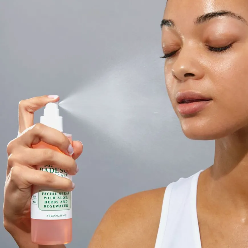 Facial Spray With Aloe, Herbs & Rosewater er en kultfavoritt, flerbruks fuktgivende ansiktsmist med rosevann og aloe vera, som gjenoppliver dehydrert hud med en sunn, duggfrisk glød og avdekker strålende, re-energisert hud. Formulert med klargjørende timianekstrakt.