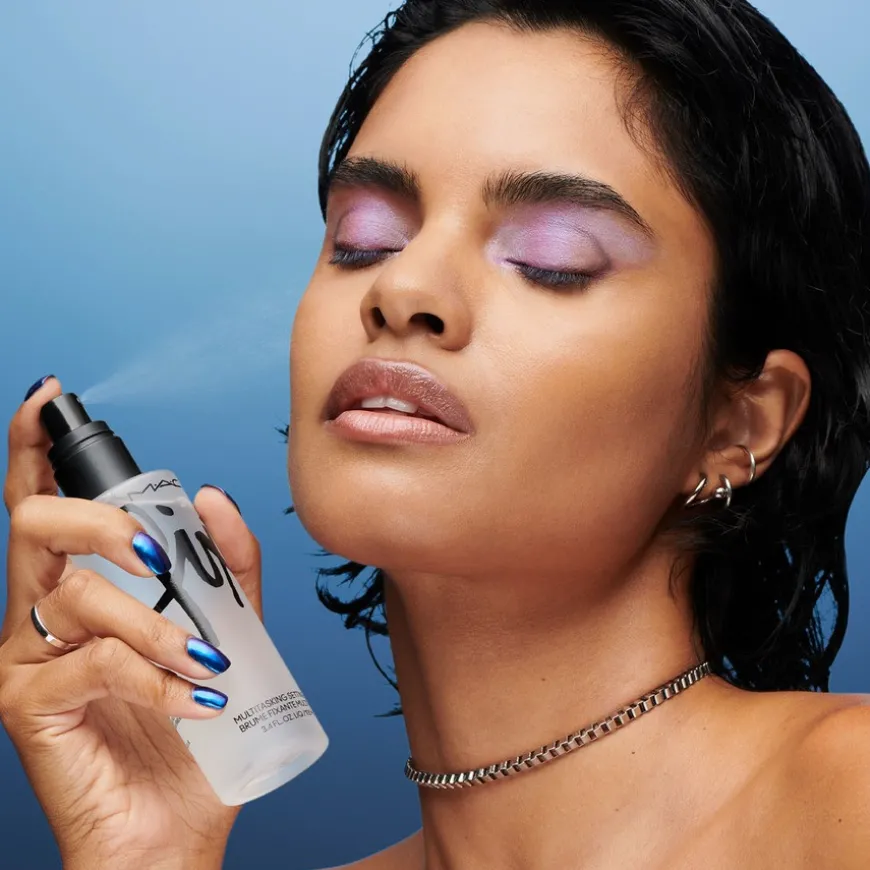 - For ansiktsprodukter, påfør din foretrukne pudderfoundation og spray lett over hele ansiktet for å fiksere og fukte.