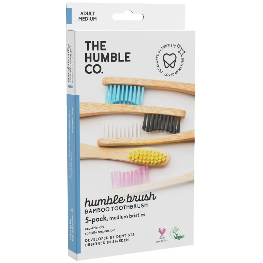 Humble Flat Curved Adult Medium 5pk er en familiepakke med myke tannbørster med skaft av 100 % biologisk nedbrytbar bambus. Tannbørstene har en kvalitetskost/børste med en høy grad av nylon, som ifølge studier, brytes raskere ned enn børster med lavere grad av nylon.