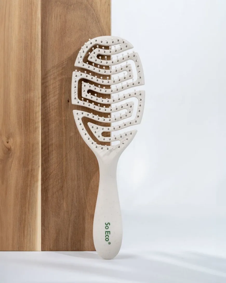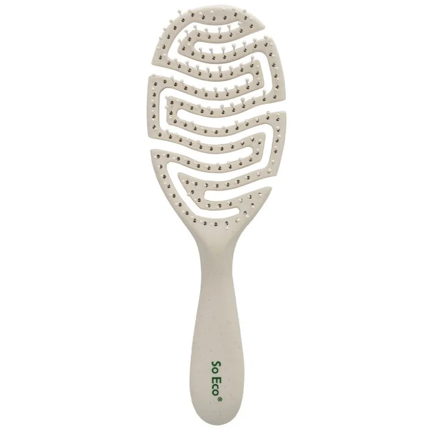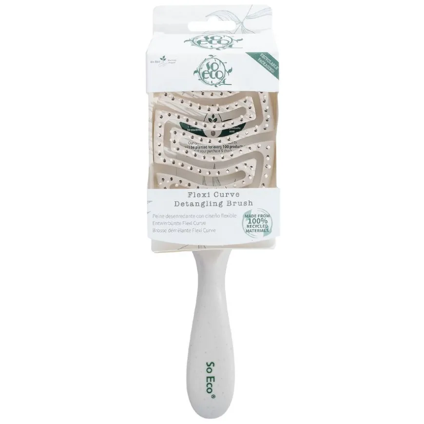 Flexi Curve Detangling Hair Brush fra So Eco er designet for smertefri børsting og glatt, håndterbart hår uten floker. Børsten glir lett gjennom både vått og tørt hår, og den fleksible utformingen tilpasser seg hodebunnen for en behagelig opplevelse. Med sitt ventilerte design bidrar den til rask tørking og enkel styling. Børsten er laget av 100 % post-consumer resirkulerte materialer og er egnet for alle hårtyper. So Eco er et PETA-godkjent, cruelty-free og vegansk merke som fokuserer på miljøvennlige prinsipper og plastfri emballasje.