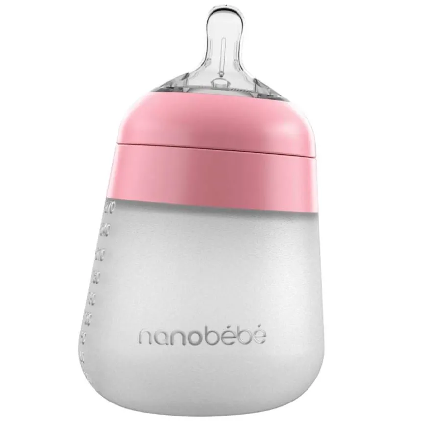 Nanobébé Flexy silikontåteflaske, antikolikk 270ml. Flexy-flasken er anti-kolikk takket være tåtesmokkens unike, avanserte 360º ventilasjonssystem som motvirker kolikk gjennom å minske trykket inne i flasken ved mating. De tre ventilene frigjør luft selv når smokken er dekket av babyens munn.