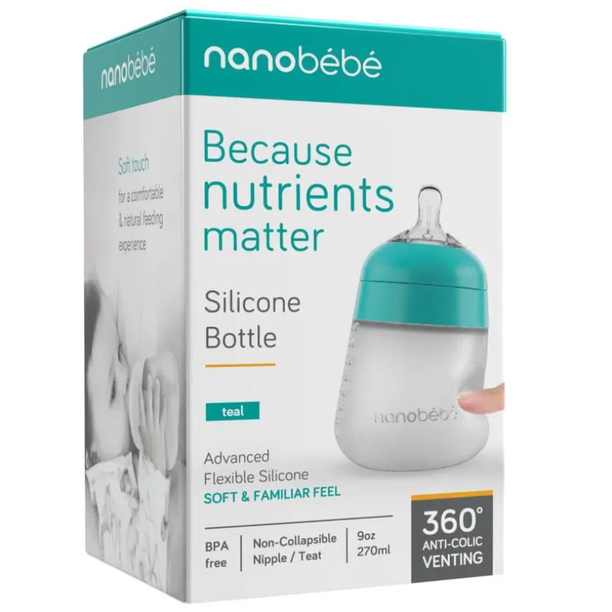 Nanobébé Flexy silikontåteflaske, antikolikk 270ml. Flexy-flasken er anti-kolikk takket være tåtesmokkens unike, avanserte 360º ventilasjonssystem som motvirker kolikk gjennom å minske trykket inne i flasken ved mating. De tre ventilene frigjør luft selv når smokken er dekket av babyens munn.