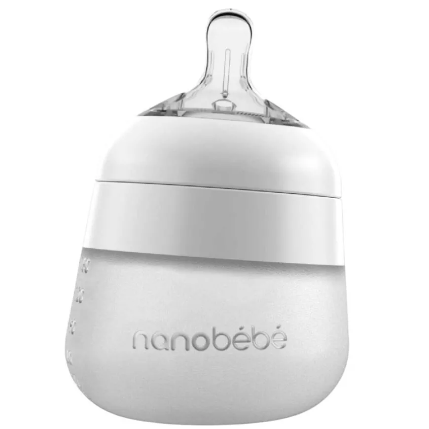 Nanobébé Flexy silikontåteflaske, antikolikk 150ml. Flexy-flasken er anti-kolikk takket være tåtesmokkens unike, avanserte 360º ventilasjonssystem som motvirker kolikk gjennom å minske trykket inne i flasken ved mating. De tre ventilene frigjør luft selv når smokken er dekket av babyens munn.
