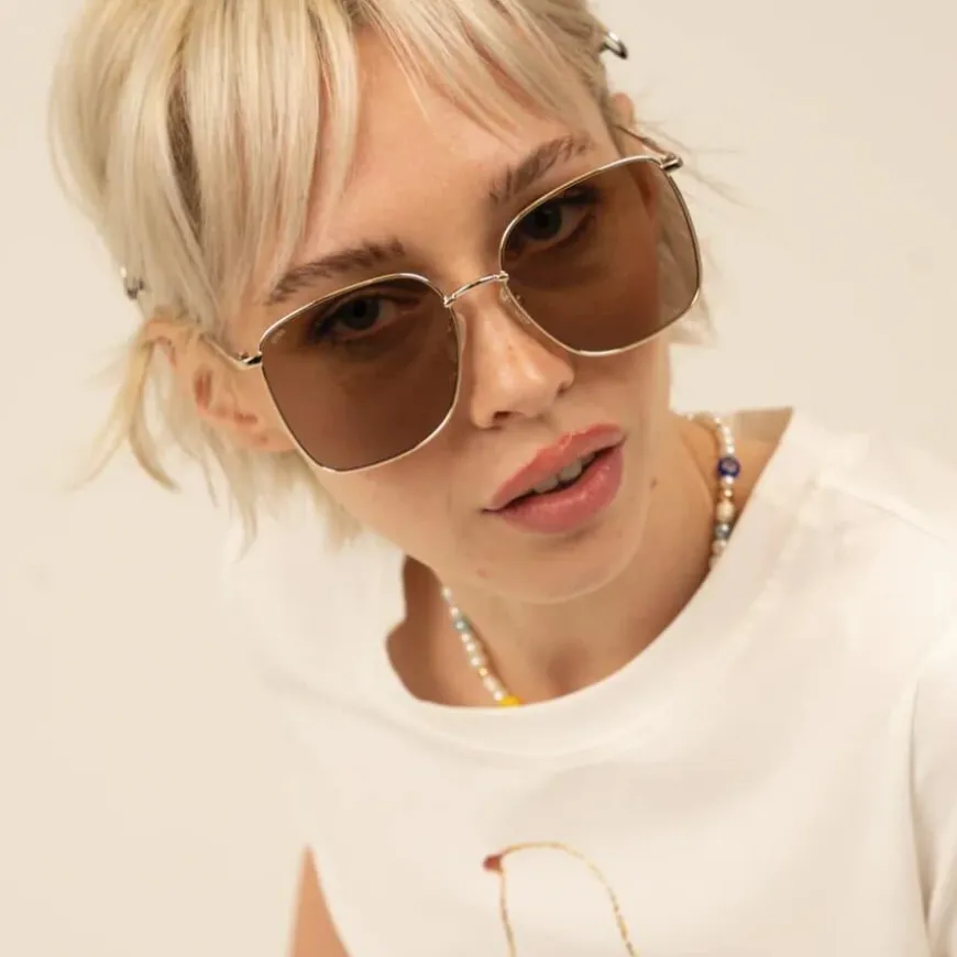 Florence Gold/Brown fra Otra Eyewear er en elegant og luksuriøs solbrille med stor firkantet metallramme i gull. Det vintageinspirerte designet gir et uttrykk av sofistikasjon, mens de varme brune linsene tilfører dybde og stil. Brillen kombinerer funksjonalitet og mote, med 100% UV-beskyttelse som skjermer øynene på solrike dager. Den leveres i et vegansk etui for praktisk og bevisst oppbevaring. En ideell solbrille for deg som ønsker et distinkt og klassisk uttrykk.