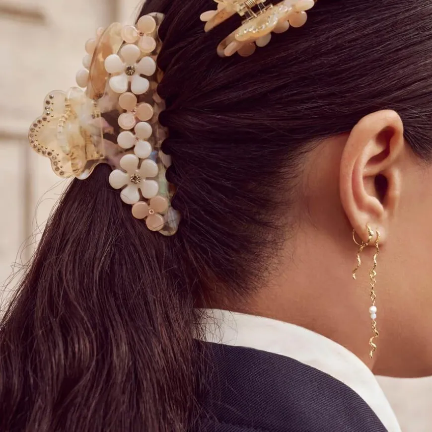 Florina Hairclaw fra Maanesten er en vakker hårklype som bringer sommerlige vibber til frisyren din. Med sine tredimensjonale blomstermotiver og fine farger gir den et friskt og feminint uttrykk. Den er laget av slitesterkt acetat og jern med miljøvennlig elektrobelegg, noe som sikrer både stil og funksjonalitet. Perfekt for å holde håret på plass med en lett og elegant følelse – enten til hverdags eller spesielle anledninger.