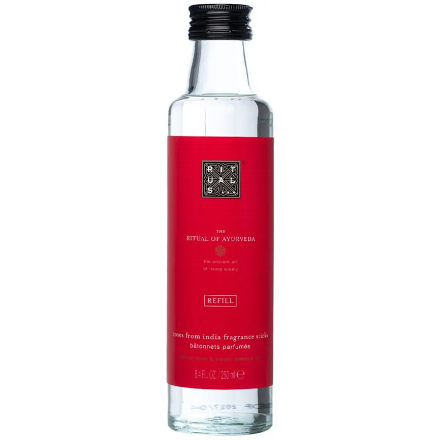 Fragrance Sticks The Ritual of Ayurveda Refill lar deg enkelt fylle på duftpinnene dine to ganger, slik at du kan fortsette å nyte den harmoniske duften av indisk rose og søt mandelolje. Denne beroligende og balanserende duften kombinerer friske plommenoter, florale peoner og eksotiske krydder, avrundet med en varm base av hvit musk. Flasken er laget av 95 % resirkulert glass, noe som gjør den til et mer bærekraftig valg for hjemmet.