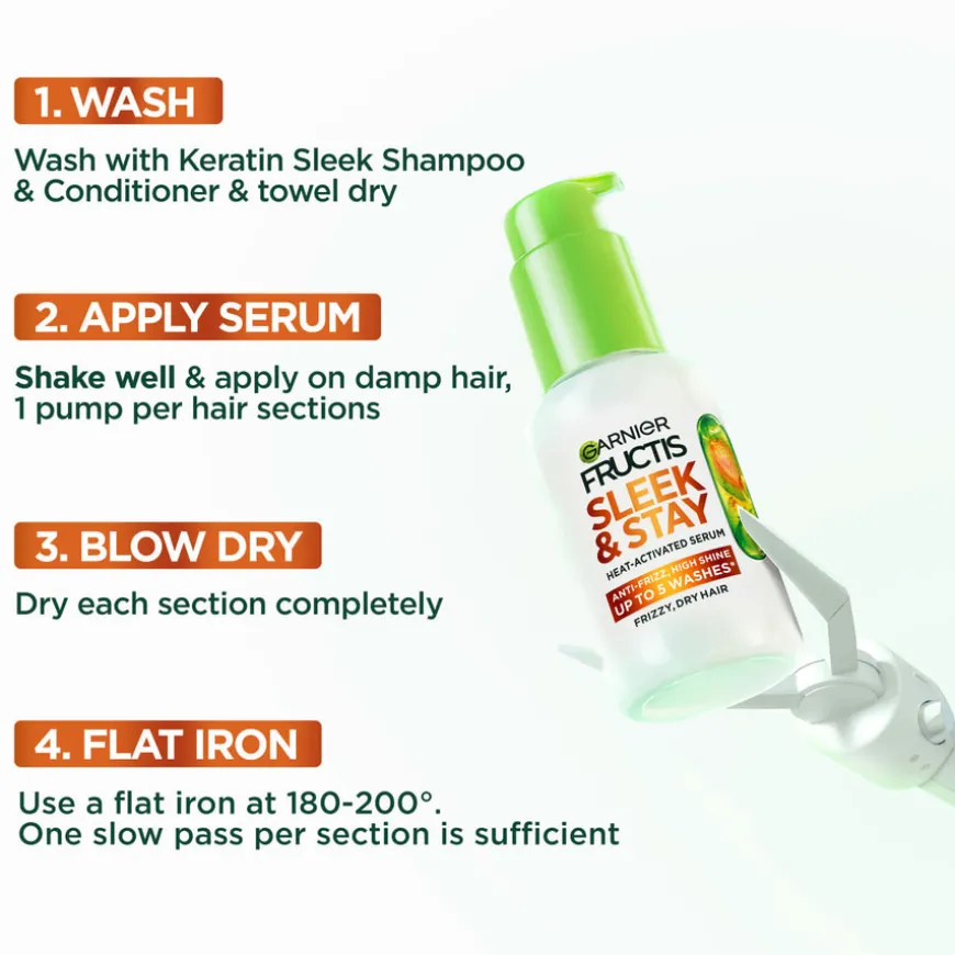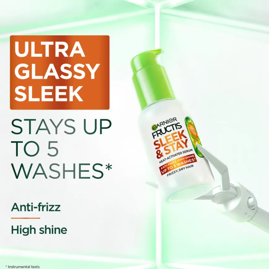 Garnier Fructis Sleek & Stay Leave-in Serum er et hårserum som passer for deg som har tørt og brusete hår. Formelen gir strålende og langvarig glans samtidig som den beskytter håret mot varmeverktøy (opptil 230 grader*) og mot brusete hår. Beriket med 5 % alpha-silane som bidrar til et langvarig resultat. Formelen aktiveres ved hjelp av varmeverktøyet og resultatet holder også selv om om luftfuktigheten* er høy. Fructis Keratin Sleek & Stay hårserum er steg 4 i en komplett rutine som gir glatt og glansfullt hår – og resultatet holder i opptil 10 dager og tåler 5 hårvasker****.