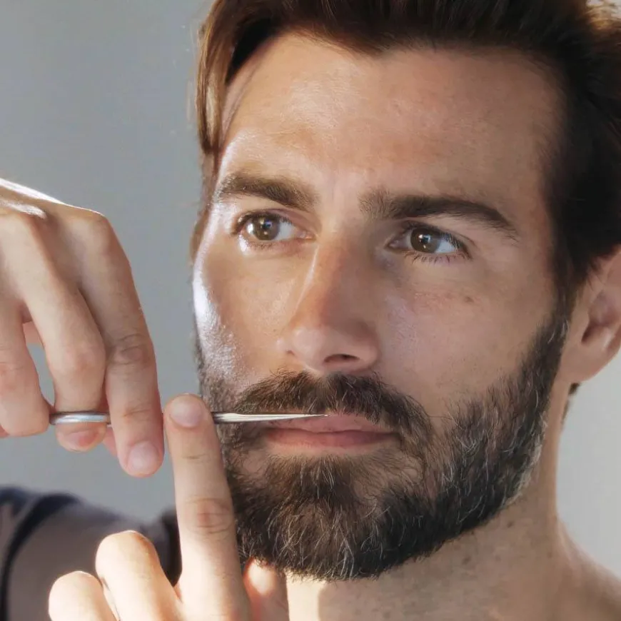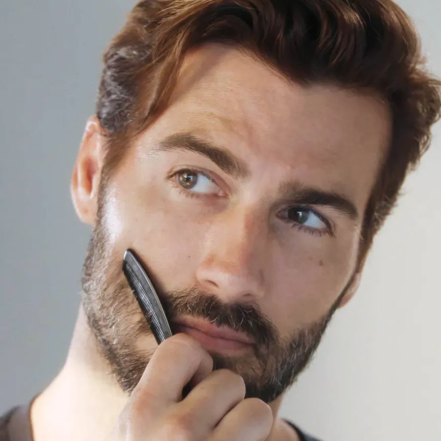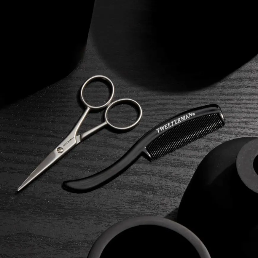 Grooming Kit med kam og trimmesaks til bart, skjegg og pannehår. Saksen har skarpe, rette blader og er perfekt for presisjonsarbeid.