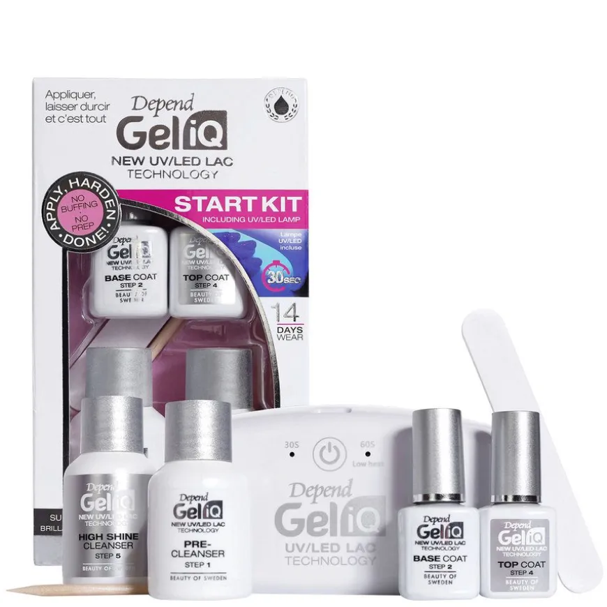Gel iQ Start Kit er et begynner sett fra Depend som gir en rask og enkel påføring med et svært glansfullt resultat med “volum-effekt” som skiller seg fra vanlig neglelakk. Ny geleformel med svært høy iQ. NO PREP innebærer at du ikke trenger å forberede din naturlige negl med filing eller behandle med sterk primer som kan forverre neglekvaliteten din, noe som skal unngås. Gel iQ trenger bare lett rengjøring med en mild Pre-Cleanser før du foretar lakkbehandlingen. UV-/LED-lampen er spesielt utviklet med en herdetid på 30 sekunder for hvert påføringstrinn. Symbiosen mellom lampe og lakk gir en selvutjevning der eventuelle striper forsvinner under herdingen, selv om du ikke har lakkert helt jevnt.