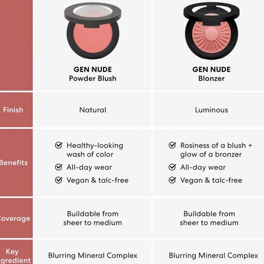 Gen Nude Blonzer kombinerer den rosa fargen fra en blush med den varme gløden fra en bronzer. Denne silkemyke, talkumfrie formelen gir deg gløden som om du har vært en dag på stranden. Byggbar 2-i 1 formel som er beriket med mineralbaserte, lysreflekterende perler, smelter inn i huden for et naturlig resultat som varer hele dagen.
