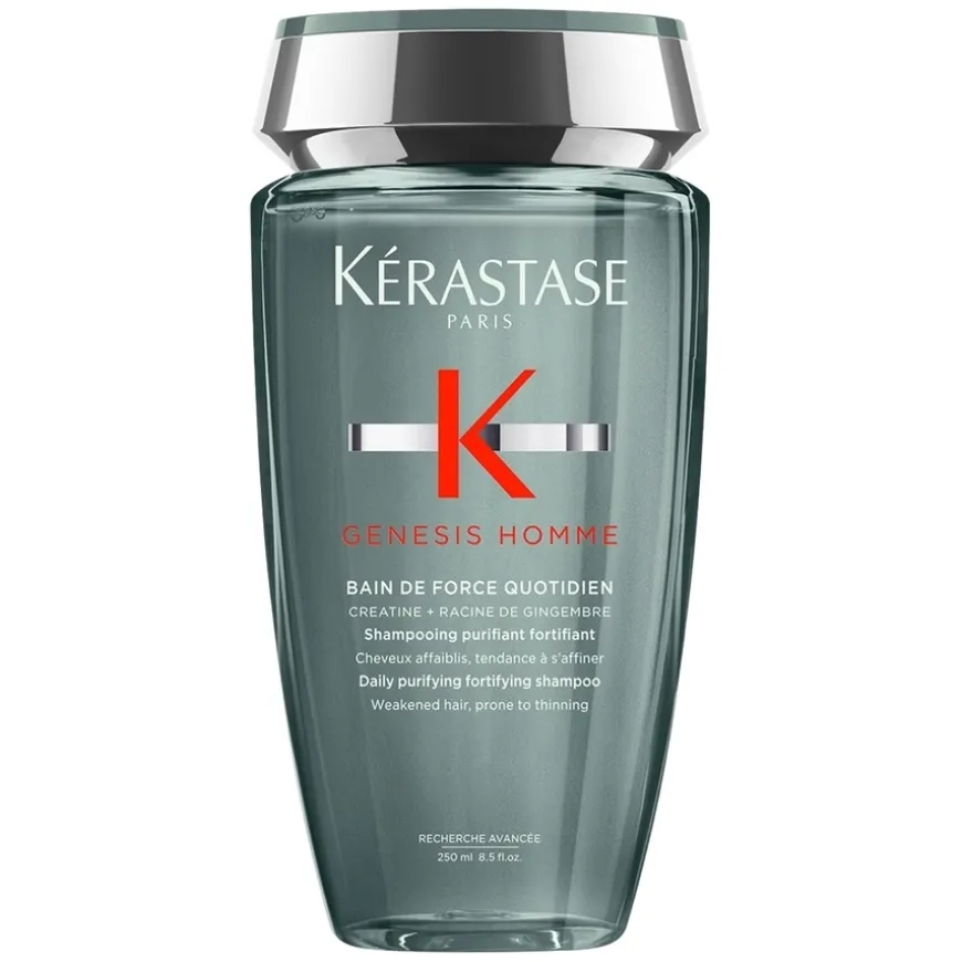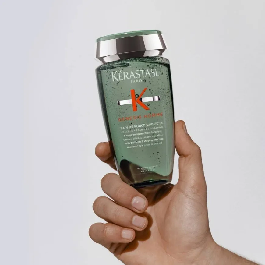 Kérastase Genesis Homme Bain de Force Quotiden er en daglig rensende, styrkende shampoo for menn med svekket hår med tendens til å tynnes ut. Gir en intensiv og effektiv rengjøring takket være dens evne til å danne et sjenerøst, tykt og kremet skum som fjerner smuss og overflødig olje. *Forbrukertest Bain de Force Quotidien på 59 personer.