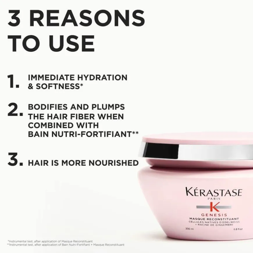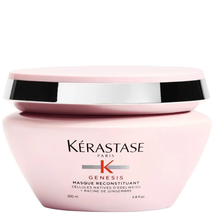 Kérastase Genesis Masque Reconstituant Hair Mask er en intensiv styrkende hårkur til svekket hår, forebygger håravfall som følge av hår som knekker. Den tykke sammensetningen tilfører intensiv næring, løser opp floker og styrker håret for å redusere risikoen for at håret skal knekke. Hårkuren er beriket med en kombinasjon av Edelweiss Native Cells og ingefærrot, og gjenoppretter håret ved å styrke partier hvor fibrene er svekket. Den kraftfulle kombinasjonen av pleiende ingredienser gjør det enkelt å gre gjennom håret, samtidig som håret blir tilført næring og blir mykt. Håret etterlates intensivt styrket, mykt og glansfullt.