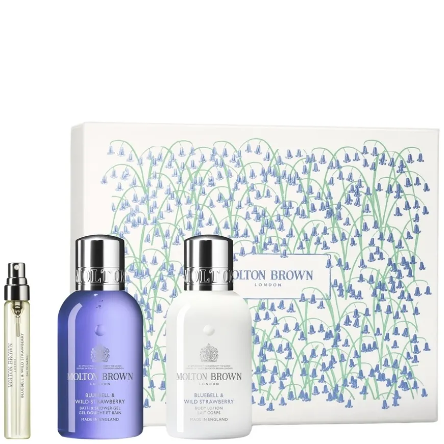 Bluebell & Wild Strawberry Travel Gift Set er et herlig og praktisk gavesett fra Molton Brown med florale og fruktige noter. Settet inneholder tre produkter i reisestørrelse: en 7,5ml Eau de Parfum, en 100ml Bath & Shower Gel og en 100ml Body Lotion – alle i den romantiske duften Bluebell & Wild Strawberry. Med noter av saftige villjordbær, duggvåte klokkehyasinter og myk drivved, bringer dette settet tankene til en frisk vårdag i skogen. Perfekt som gave til Morsdag eller andre spesielle anledninger. Produktene er 100 % vegetariske, cruelty-free og produsert med omtanke i England. Passer alle hudtyper.