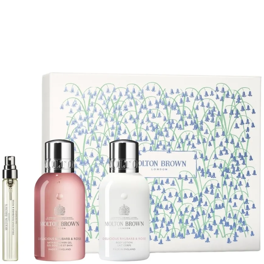 Delicious Rhubarb & Rose Travel Gift Set er et luksuriøst gavesett fra Molton Brown, perfekt for reise eller som en elegant gave. Settet inneholder tre reisevennlige produkter i den ikoniske gourmand-duften Delicious Rhubarb & Rose: en 7,5ml Eau de Parfum, en 100ml Bath & Shower Gel og en 100ml Body Lotion. Duftnotene kombinerer syrlig rabarbra, frisk grapefrukt og myk vanilje – en fristende blanding som vekker minner om vårens piknik og søte bakverk. Produktene gir fuktighet, rens og velduft til huden, og er 100 % vegetariske, cruelty-free og ansvarsfullt produsert i England. Passer alle hudtyper.