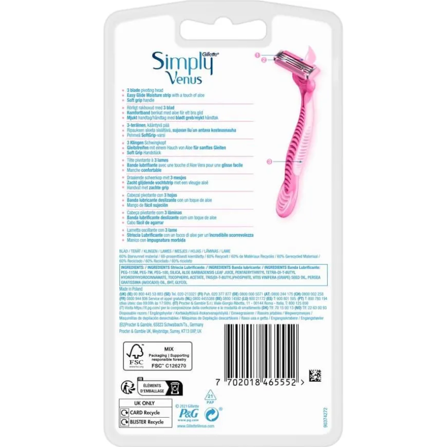 Gillette Simply Venus inneholder 4 engangshøvler for kvinner. Engangshøvlene for kvinner gir en tett barbering til en svært god verdi. De har et 3-bladet dreibart hode for områder som er vanskelige å barbere og en lubrastripe for god glid. Nyt en tett barbering med større komfort (vs. Venus Simply 2).