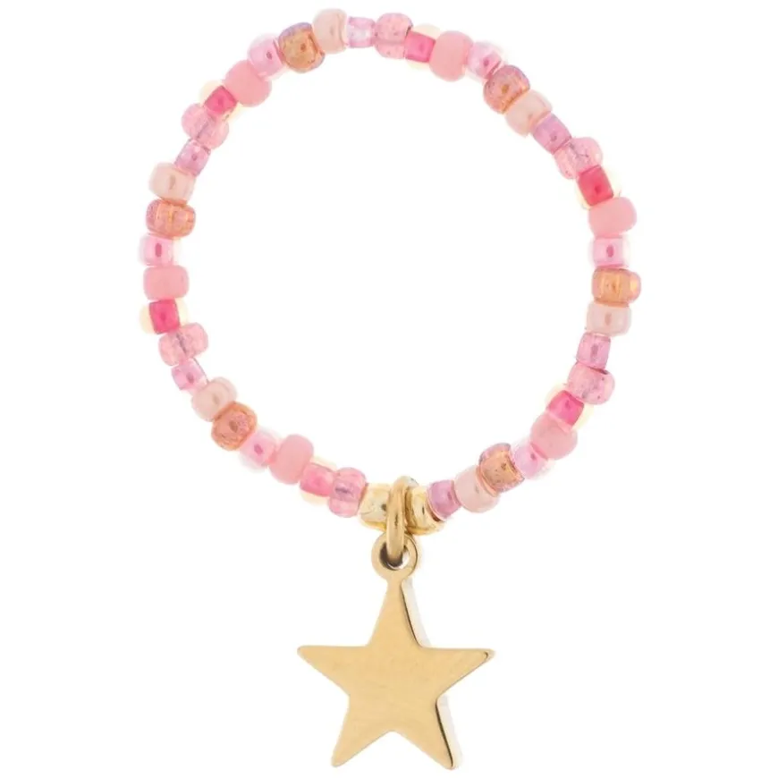 DARK Glass Bead Ring 2mm With Charm Rose Mix With Star Charm er en delikat og fargerik ring laget av små 2 mm glassperler i en vakker rosamiks. Den er utsmykket med et lite stjerneanheng som gir et lekent og stilrent preg. Ringen er enkel å kombinere med andre smykker for en personlig stil.