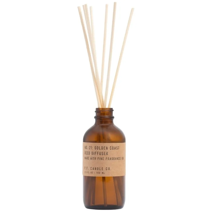 P.F. Candle Co. Golden Coast Reed Diffuser bringer atmosfæren fra Californias kyst inn i hjemmet ditt. Med duftnoter av eukalyptus, havsalt, redwood og palo santo skaper den en frisk, beroligende og revitaliserende opplevelse inspirert av Big Sur.