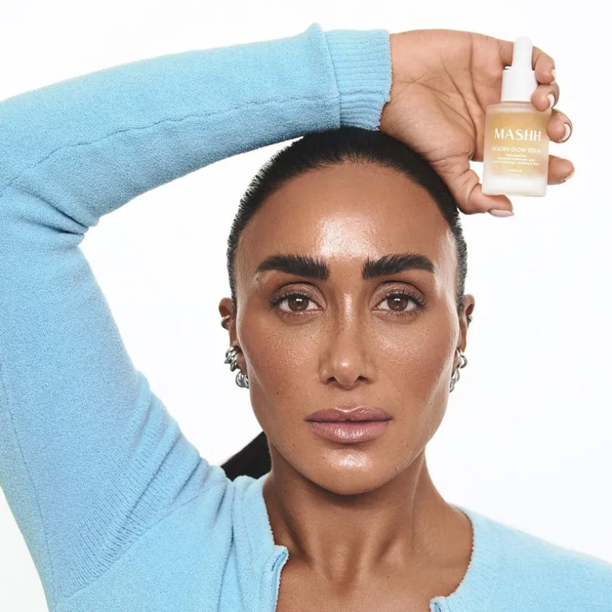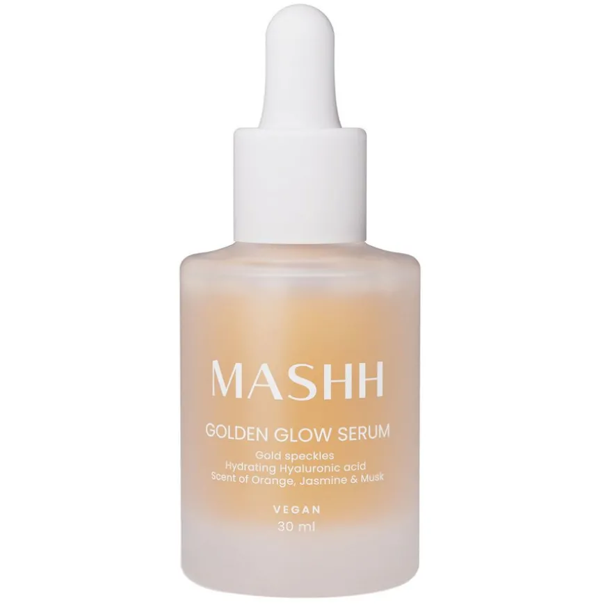 Golden Glow serum har en lett tekstur og er beriket med gullfargede tråder som gir glød til huden. Den lette formelen inneholder blå agave-ekstrakt og fuktighetsgivende hyaluronsyre med ulik molekylvekt som også vil bidra til en fin og jevn glød. Hyaluronsyre er en kjent ingrediens i hudpleie som kan bidra til å bedre hudens elastisitet. Serumet er fint å bruke etter maske for å gi en ekstra fuktighet og glød til huden.