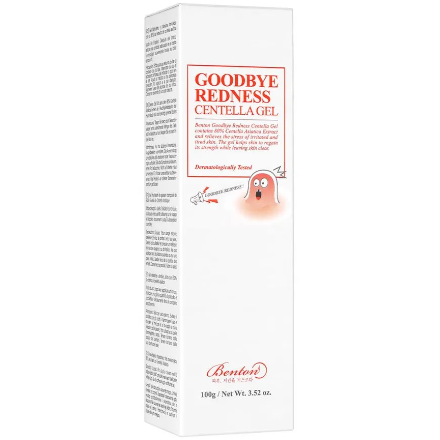 Benton Goodbye Redness Centella Gel er en lett og fuktighetsgivende gel som lindrer rødhet og irritasjon. Denne gelen er basert på hele 80% ekstrakt av centella asiatica (en populær ingrediens i koreansk hudpleie), og den roer, reparerer og gjør sensitiv og irritert hud mykere. Gelen har en litt sur pH-verdi på ~6. Dette er for å balansere hudens naturlige pH for en sunn og velfungerende hudbarriere. Inneholder også ekstrakt av tetre, som virker betennelsesdempende og beroligende.