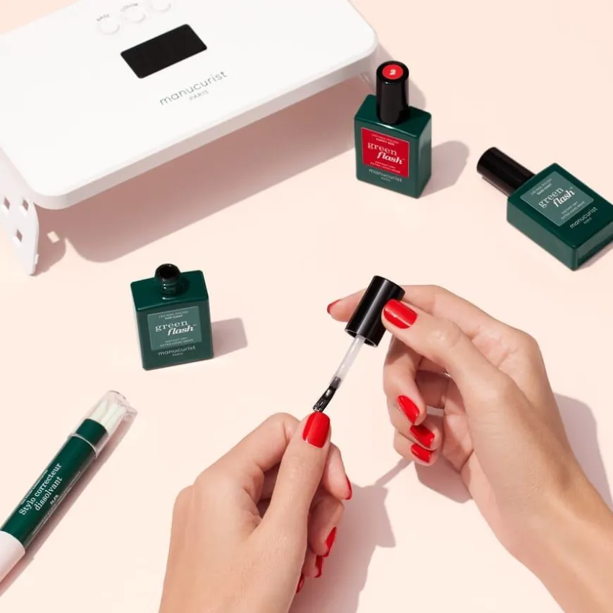 Green Flash Full Routine Hortencia & Poppy Red Kit er et komplett Led-startsett som gir deg alt du trenger for en profesjonell manikyr hjemme. Dette innovative systemet kombinerer fordelene fra semi-permanent og klassisk neglelakk, med umiddelbar tørk under Led-lampe, høy glans og holdbarhet i opptil 10 dager – helt uten skadelig innvirkning på neglene. Settet inneholder to bestselgerfarger – den klassisk røde Poppy Red og den delikate Pale Rose, en vitaminberiket base coat, topp coat, en kraftig 36W sammenleggbar Led-lampe, acetonfri fjerner og fjerneklips. Formulert med bio-baserte, veganske ingredienser og laget i Frankrike, er dette settet både effektivt og skånsomt – også for sensitive brukere. Perfekt for deg som ønsker høy ytelse uten kompromiss på helse eller miljø.