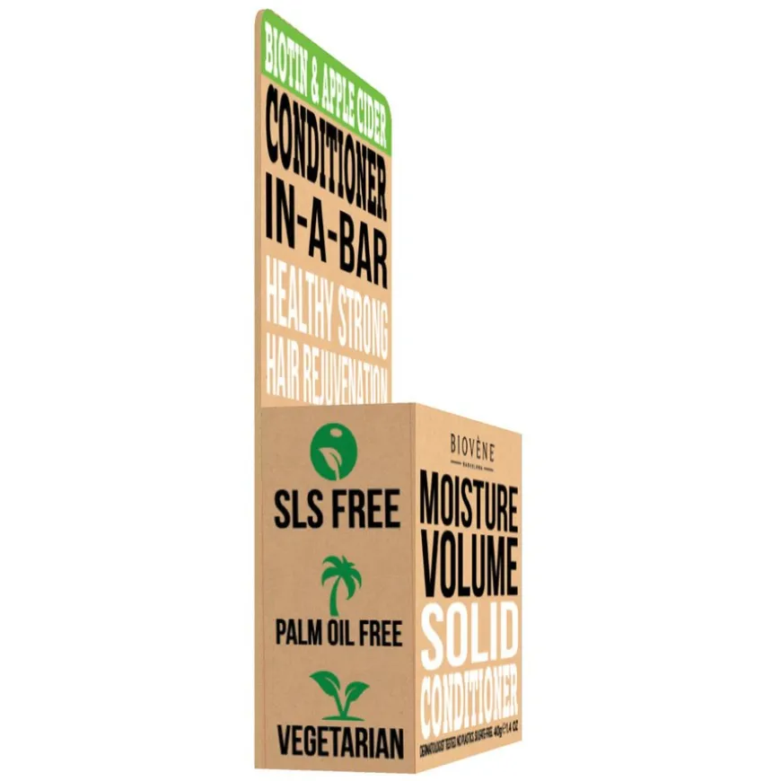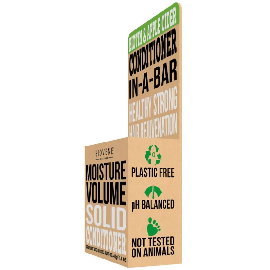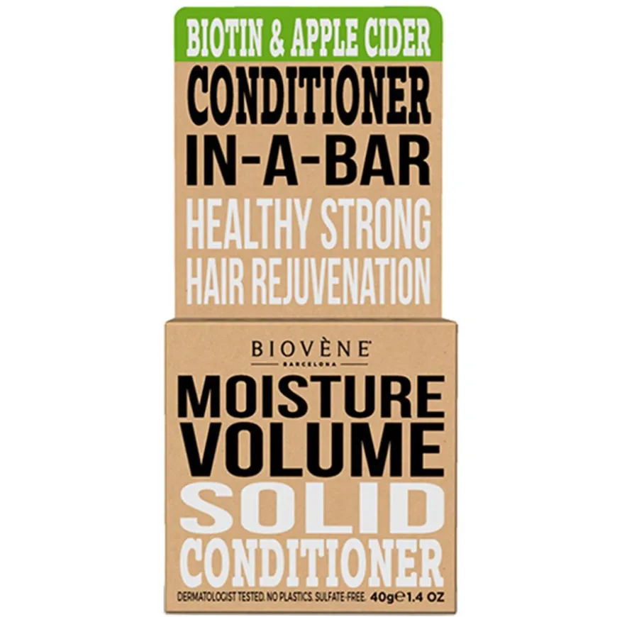 Biovène Hair Care Conditioner Bar Moisture Volume Biotin & Apple Cider er en miljøvennlig balsambar med førsteklasses ingredienser;naturlig eplecidereddik, epleekstrakt, biotin, sheasmør og bivoks. Balsamen inneholder en fuktighetsgivende og nærende blanding av biotin og naturens beste planter for å øke fuktigheten og volumet for et tykkere, fyldigere og sunt hår.