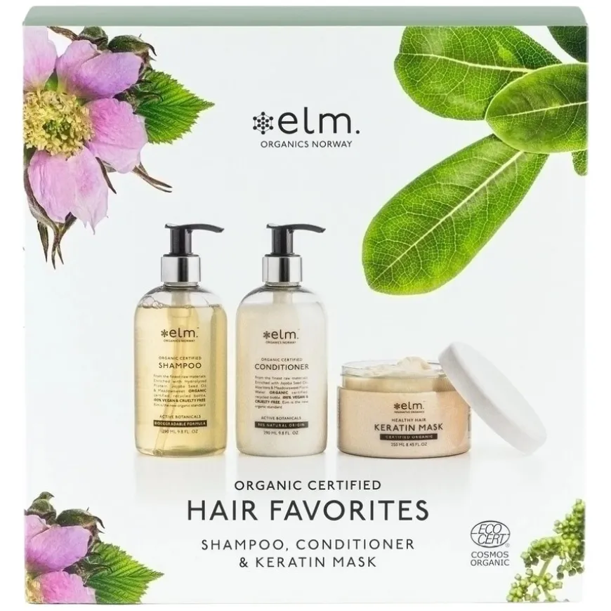 Hair Favorites Gift Set fra Elm Organics er et vakkert gavesett med tre av deres mest populære hårpleieprodukter – shampoo, balsam og hårmaske – formulert med økologiske ingredienser og aktiv plantekraft. Settet gir komplett pleie til håret: skånsom rens, næring og fuktighet, samt intensiv reparasjon. Hvert produkt styrker og mykgjør håret, samtidig som det etterlates glansfullt, sunt og lettere å håndtere. Perfekt gave til deg selv eller noen du vil unne en naturlig, luksuriøs hårpleierutine.