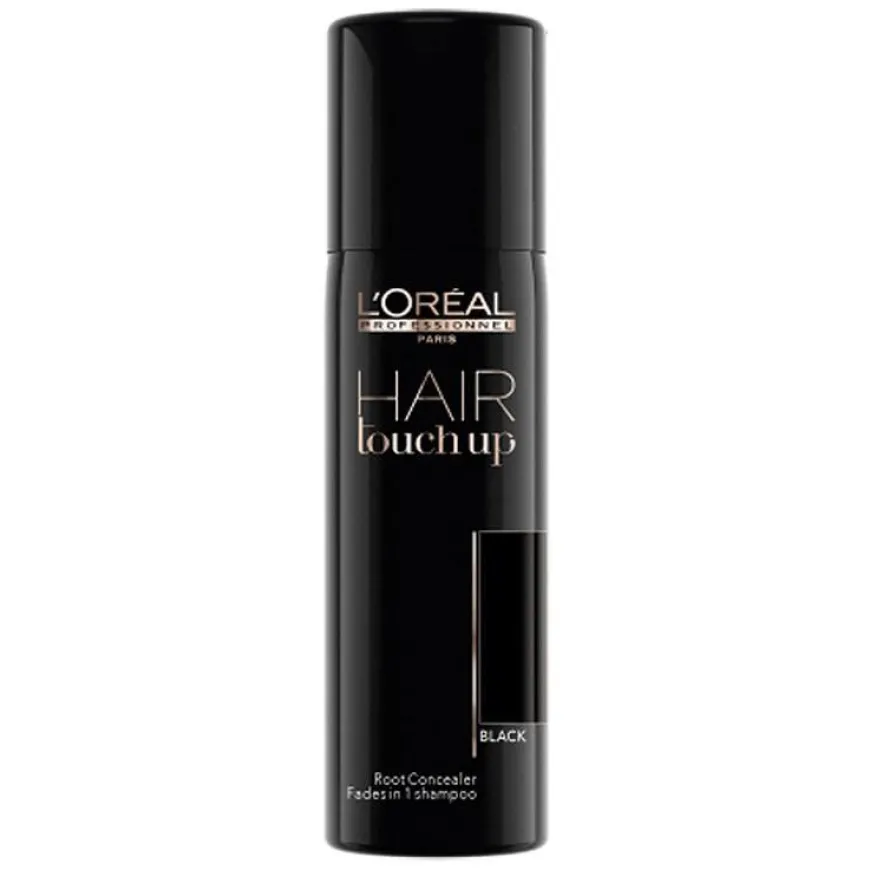 L’Oréal Professionnel Hair Touch Up for svart hår er en midlertidig touch up spray til hårrøttene for å skjule grått hår. Formulert med sminkepigmenter, blander den seg sømløst med håret for en best mulig dekkevne. Den er enkel å bruke, den tørker umiddelbart og den er ut av håret etter em vask med sjampo* vasker ut i bare én sjampo*