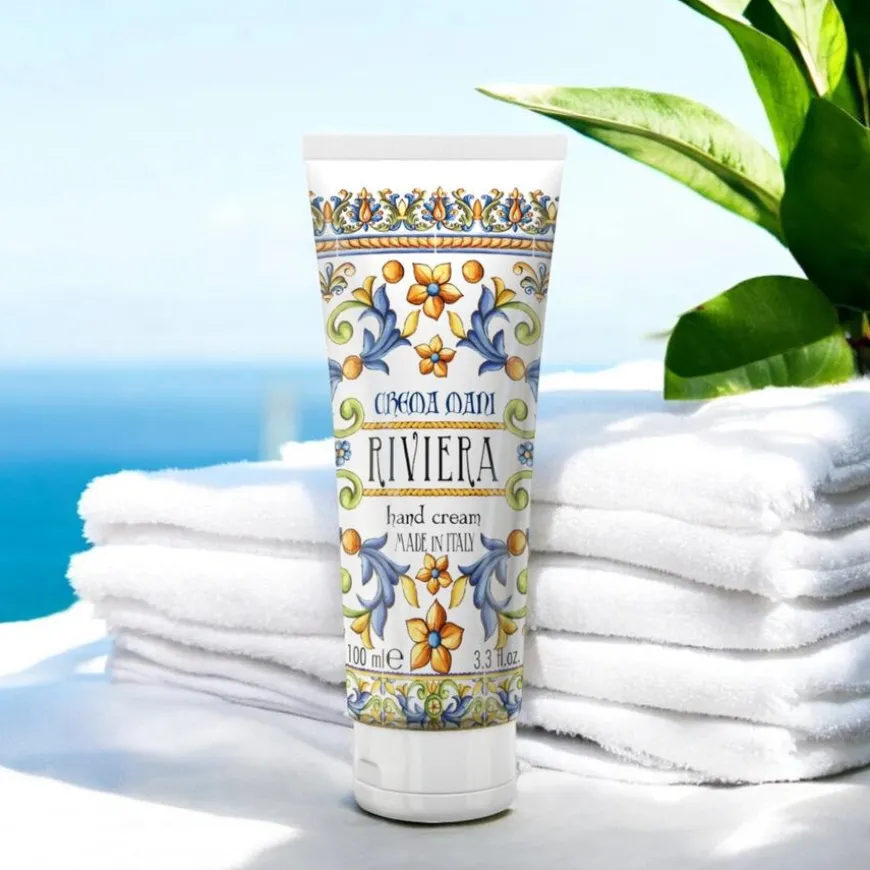 Hand Cream Riviera er en luksuriøs herlig velduftende håndkrem med fuktighetsgivende ingredienser som Aloe Vera og vitamin E og med dufter inspirert av Italias planter og frukter. Trekker lett inn i huden og etterlater den myk og full av duft og fuktighet. En duft som åpner med en frisk og fruktig toppnote av Nashi Pære, ledsaget av et snev av Iris, som gir dybde og eleganse. I hjertet av duften skaper Jasmine og Appelsinblomst en lett og sensuell blomsterbukett, mens den rike og omsluttende baseduften består av vanilje, pralin og patchouli, som gir sødme, varme og dybde.