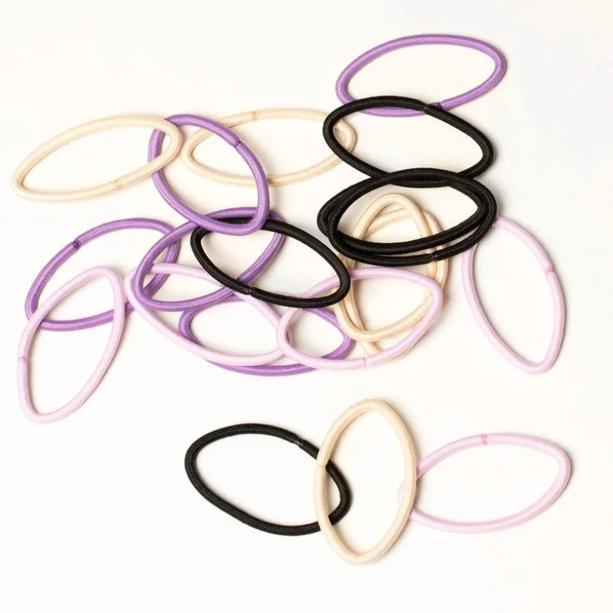 Elastic Hair Bands er klassiske hårstrikk. Pakken inneholder 20 strikk i fargene lavendel, lys rosa, beige og svart. Hårstrikkene er 4 mm tykke og har en omkrets på 5,5 tommer. Perfekte å bruke til å sette opp håret med.